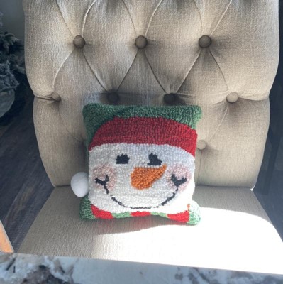 The holidays are a time to be shared with friends and loved ones. Bring a whimsical touch to your holiday decor with this hooked gift pillow. Featuring a cheerful snowman with a fun pom-pom accent in a classic red, white and green colorway. This 8-inch x 8-inch pillow makes a great gift for the holiday hostess or a close friend. Crafted with acrylic yarn on cotton canvas and lofty polyester filling. Spot cleaning recommended. Size: Each pillow is 8 x 8 inches.
