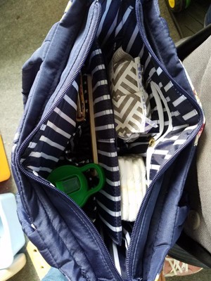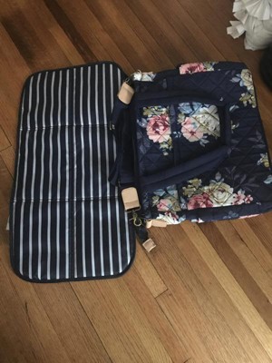 This is a great bag. It doesn’t necessarily look like a diaper bag but definitely has all the functions of one. It’s a great quilted design but is a navy floral that was perfect for a neutral option for the surprise gender baby (waiting until the birth to find out). I love that the carry straps are cushioned but then there is a messenger style strap too. There are pockets to spare and is a very sturdy design. I’m so happy with it!