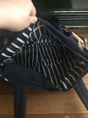 I have a few backpack style diaper bags so I thought I'd try something new with this one. I'm a little put off by the entire bag being made of polyester just because it makes it look and feel a tad bit cheap, but this does mean that the entire bag is wipeable and probably easy to keep clean. It is very spacious inside, with four pockets that can hold several diapers each. In the picture I've included you can see four diapers (size 5) in one pocket. There are also two large pockets on the outside that are also big enough to hold diapers. The side pockets unfortunately are a bit narrow and do not stretch to hold my adult sized water bottle, but will hold a standard size baby bottle. Note that there are also no stroller straps. Maybe not my first pick to take on a family outing, but overall I'm impressed with its capacity and think it'll be a nice bag for Church or a playdate.