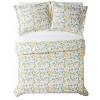 Pink verbena blossoms are mixed with yellow lemons in this trend right pattern. The reverse is a solid white coordinating to the face print. Face cloth is 100% cotton and the reverse is a soft 100% microfiber polyester. Each set contains coordinating pillow shams where twin has one sham and larger sizes include two shams. Face is 100% cotton woven fabrice with a printed pattern and reversing to 100% microfiber polyester woven fabric. This item is machine washable, but please be sure to use appropriate sized machinery to avoid any excess wear on the items. Includes: one full/queen duvet cover 90x90 inches and two standard shams 20x26 inches.