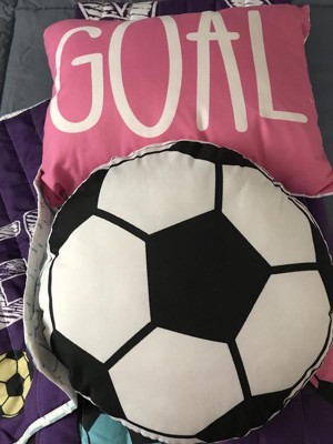 [This review was collected as part of a promotion.] There's a lot I love about this purple soccer quilt set for my daughter. First, it's not overly "girly" or frilly, if you know what I mean. She's a tough cookie and I wanted something that wasn't all pink and bubbles and giggly. This fit the bill. Then the little throw pillow and color scheme really bring it home. She loves sleeping with it. Who knows, maybe she's dreaming of that open field breakaway!!