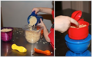 Learning Resources understands the importance of providing children the best tools for learning. Best of all, they know their educational toys must be fun or children won't play with them. This Primary Science Mix and Measure Set simply calls out to children. This box sat on my upper shelf for one day and I got at least 50 questions about it. Since I have a home daycare full of preschoolers, I had intended to have a whole day of planned activities with this product, but the children did not want to wait. That natural curiosity is exactly what Learning Resources uses to fuel new product development. If this new 2012 learning toy is any indication of what's to come this year, I'm absolutely thrilled. There are three measuring spoons - a tablespoon, a teaspoon, and 1/2 teaspoon. Notice the yellow measuring spoon: it visually represents half of a teaspoon (the orange measuring spoon). There is a 1 cup measuring cup. Then there is also 1/2 cup measuring cup and two 1/4 cup measuring cups; the extra thought put into that is fabulous, so that children can see that those three pieces together make a full cup. There is also a tall 2-cup pitcher a short 2-cup pitcher and a 4-cup bowl with a lid. This Mix and Measure Set also comes with a scale and 10 laminated activity cards with all kinds of activities and ideas for using these wonderful tools. I poured a bag of dry rice into a large bin and turned the kids loose to explore this new science kit. They had so much fun pouring and scooping and measuring and weighing. They worked together, planning and discovering. They shared the tools, discussing the differences in the sizes. They even learned that a dustpan and handbroom are great for cleaning up small items. They asked me questions about the names of the different pieces and learned several new words. After about an hour of exploratory play, we had to clean up for snacktime, but they continued to talk about it well into the afternoon. This was also the first requested activity the next day. This Mix and Measure Set gets FIVE STARS!