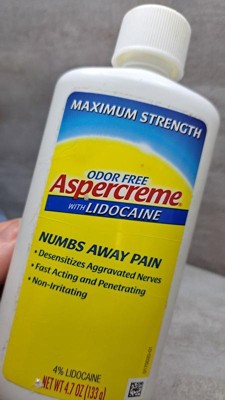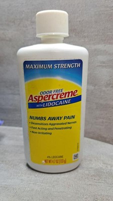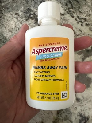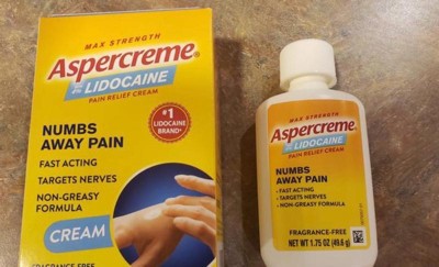 Aspercreme with lidocaine is great for pain relief. It’s fast acting and numbs away pain quickly. It also has moisturizer in it so your skin doesn’t dry out it doesn’t have a bad smell to it. It comes in different size bottles. I highly recommend this if you have any type of joint or muscle pain.