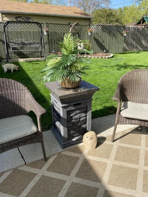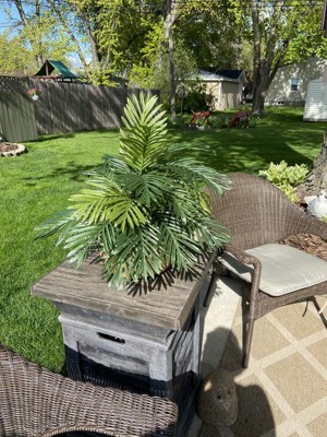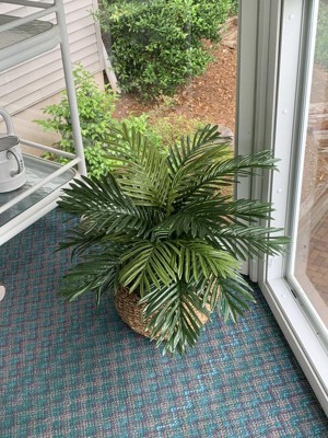 This is a very lifelike palm. I’ve had several people ask me if it was real and when I’ve said no they’ve gone up and touched it. The colors of the leaves are such bright nice shades of green. The basket is also very pretty. I had it on the patio where it looked perfect but when I read the description it did not say for outside so I brought it inside where it looks equally nice. I would highly recommend this plant.