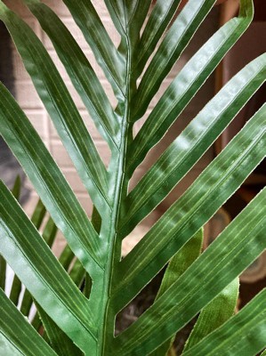 I love indoor plants but don't take the time to keep them alive. I love this palm because it looks realistic and just needs periodic dusting! The top leaves are slightly lighter color than the lower ones, which I remember from real palm plants. I think the basket is particularly pretty--it's got enough pattern/color/texture to be decorative with our mid-century style, but not so much that it distracts from the plant. I included a picture of one frond so you can see that if you look super closely you can tell that it's fake, but I don't have nosy guests over that often, lol.