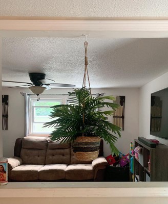 I received the 30" x 16" Artificial Phoenix Palm Plant in Hanging Basket by LCG Florals. This came shipped in a box with the packaging made to protect the plant. Unfortunately one of the palms broke off but I was able to just stick it back inside the basket. The basket is really cute almost looks like someone wove it themselves. The palm itself needs to be manipulated a bit to get the perfect look (kind of like an artificial Christmas tree) but once I hung it, the palms all spread out evenly. I currently have it hanging from the pass through with an adhesive hook I put under the trim. It adds the perfect look to my living room and kitchen. I also like that it’s low maintenance with the occasional dusting. I would love to get a few more artificial plants to add to other parts of my house because I really like the aesthetic it brings. I would definitely recommend!