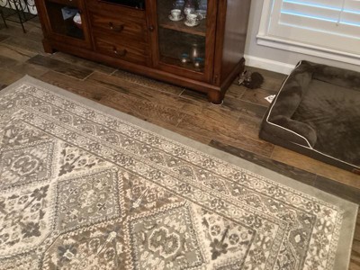 This rug is lovely, but it’s not as soft as others we have purchased. The colors also are not what is shown in the photo. I know this is a hazard of purchasing online — colors are hard to represent accurately. But just know that what appears to be a soft grayish blue in the picture is actually a brighter blue-green. What looks like a soft dusty pink is actually just khaki.