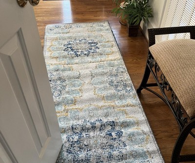 [This review was collected as part of a promotion.] This is a very pretty rug. I would have preferred a thicker pile, but as pretty as it is, I'm okay with the short pile. I was looking for something with these colors of blue and the design of this rug and the colors was just right.