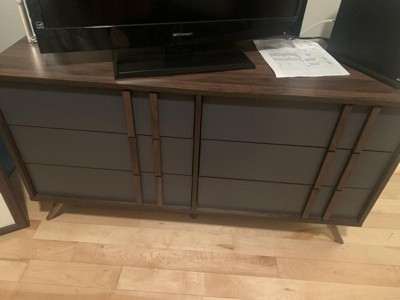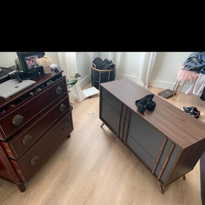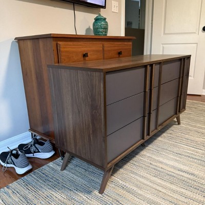 With an ultra-modern, two-tone finish and ample storage space, the Naoki dresser is sure to make an impression in any space. Made in Malaysia, this wood dresser features five spacious drawers to store clothes, linens, and more. Each drawer is fitted with metal glides for smooth movement. A two-tone gray and walnut finish are paired with long, double vertical handles for a cool, contemporary look. Requiring assembly, the Naoki dresser is supported by splayed legs that create a chic, retro profile.