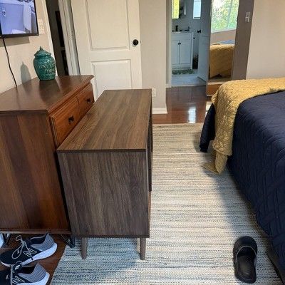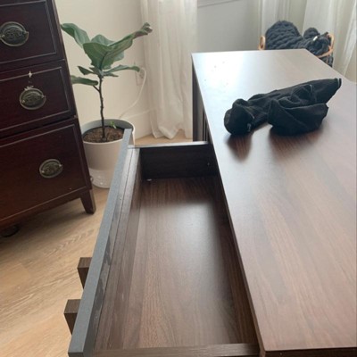 This dresser is very, very low quality. We assembled it and are so unhappy with it. Will be returning to the store. The drawers are so tiny, so shallow you can fit 2 t-shirts in them. The drawers also do not glide well at all in the roller brackets. Not good.