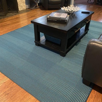 Beautiful rug! Looks expensive and defines our eating area on the patio. I also purchased the coordinating chair cushions in teal and the set looks great.