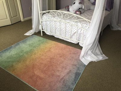 My daughters love this rainbow ombré rug. I like how it has gripping on the back so it doesn’t move around on the wood floor. The colors look exactly as pictured online. It’s the perfect soft rug for them to play on in their room. The rug also vacuums/cleans well.