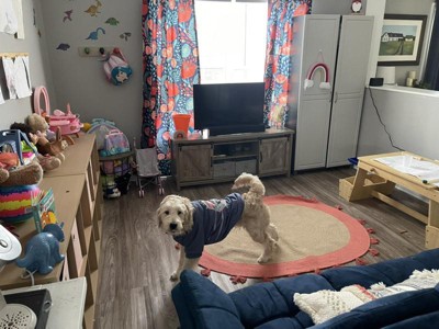 So cute and perfect for a small room. I would get either rug tape or a grippy mat to keep under the rug because it does move around often and could be a slip hazard in a toddler’s room. Also, keep in mind you can only spot clean this rug so I would not keep in on a highly used area. But I love how it looks, the colors are perfect for my Goodnight Moon nursery.