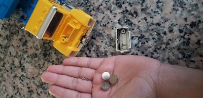 The hood piece broke & these 3 batteries fell out. If ingested, it could be very dangerous for kids.