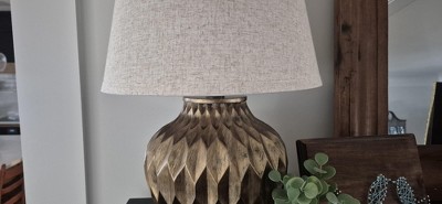 This delightful warm bronze finish table lamp features a modern urn shape body textured in a wonderful dimple motif that emulates folded paper. A simple drum shade and a bronze finish round finial complete this versatile look. Able to accommodate a high-wattage bulb, the smaller design is both stylish and functional as a reading light.