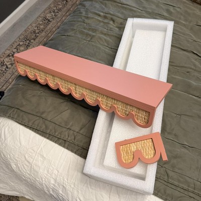 This pink floating rattan Shelf is soo Girly and Adorable I love it! It’s not super heavy, it’s sturdy, and made well. I haven’t hung it up yet since it didn’t come with any hardware so I just set it on another shelf for the time being and it sits evenly. Definitely a great little shelf.