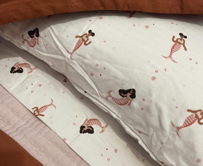 Transform your child's room into a fantasy dreamland with the Mermaid Cotton Sheet Set from Pillowfort™. Made of a brushed, 100% cotton fabric, this 220-thread-count bed sheet set is soft to the touch, and it’s decorated with a seamless print of varied mermaids with under-the-sea imagery against a white background to bring a dash of playful flair to their room. Perfect for year-round use, this mermaid sheet set comes with a fitted sheet, flat sheet and matching pillowcase(s) for a complete look. The fully elastic fitted sheet is suitable for mattresses up to 16 inches deep to ensure a snug, secure fit and create a smooth, soft surface for your child to lay on. Machine-washable for easy care and cleaning, this bedding set is perfect for everyday use — add a solid or printed coverlet or comforter, and complete the look with cute stuffed pillow buddies.