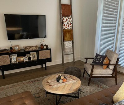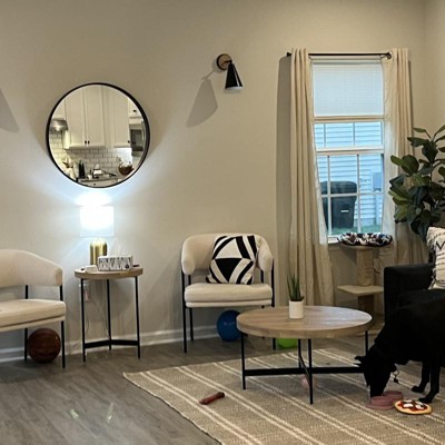 Matches the Threshold end tables. Perfect size for smaller living room spaces. I think it was a little over priced but I love it.