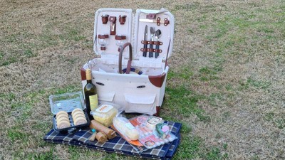 [This review was collected as part of a promotion.] This is the most beautiful picnic basket I have ever seen. It's made of nice sturdy canvas and leather. It has a beautiful dish set for 2, wine opener, cutting board, storage container and even a picnic blanket. It also has handy straps on the back to hold down the picnic blanket. My family loves this picnic basket.