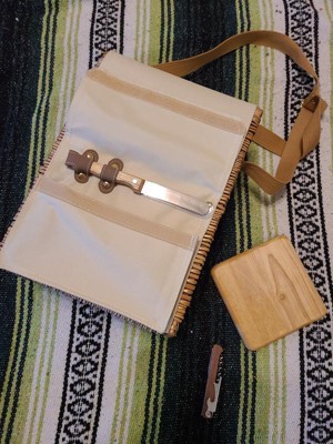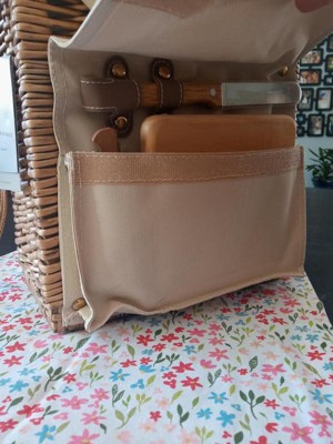 [This review was collected as part of a promotion.] This is a very nice wine and cheese picnic basket. It’s very pretty. Nice pocket for the wine. In the pocket flap there is a wine opener, knife and small cutting board. Nice bonus. Looking forward to using this!