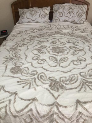[This review was collected as part of a promotion.] I received this in the mail and could not wait to put it on my bed. It’s very lightweight and soft. My insert fit inside the coverlet perfectly! It is definitely true to its size of king/California king. It lays beautifully with the design on it and the design is so subtle and pretty. The set is very soft and the design is made of chenille so it feels so nice when you’re laying covered up in it! I only wish the set had more pillowcases and matching pillows but my sheet set matches perfectly! I have gotten so many compliments on this lovely set and I highly recommend this product.