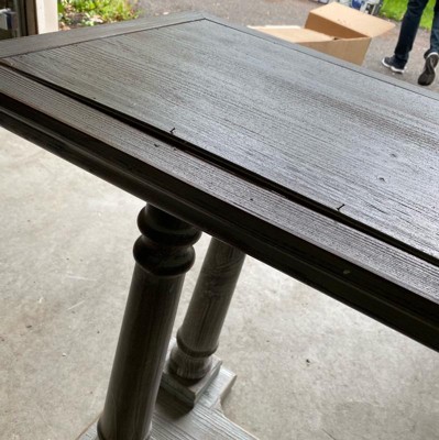 The shape and size of this table were just what I was looking for for our entryway, but the color is not at all as advertised (more of a whitewash than brown) which cheapens its look. Sadly, the legs on the right side point inwards and the right corner will not lie flat, even with my contractor husband assembling it. Sadly had to return.