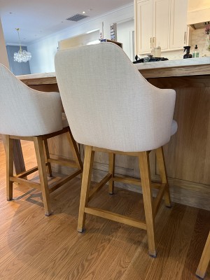 We completed a remodel/addition of our entire first floor last year and I went with $700 PB leather barstools the designer chose. They weren't comfortable but I lived with them for a year. I found these and ordreded them. The wood has a little more of an orange tint than shown in the photos so it's not a perfect match with my white oak island but it's fine. They are super comfortable. I sprayed them with scotchguard since it's not a performance fabric and I have teen boys sitting in the every weekend. They look great and for the price, they can't be beat!