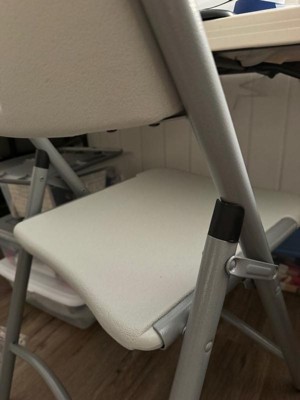 [This review was collected as part of a promotion.] I know it's just a folding chair, but it's really a great one! Very sturdy. Clean look. Durable 'plastic' seat and back. Beefy metal legs and frame. It has a metal brace going across under the seat. Definitely a good choice.