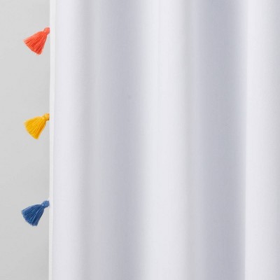 Block out unwanted light in your child's bedroom in a fun way with this Blackout Tassel Curtain Panel from Pillowfort™. This blackout curtain panel brings decorative and functional style to their space. It's detailed with tassel accents on the edging for a playful pop of texture, and the lined construction blocks out most of the sunlight to provide your child a peaceful sleeping environment. Plus, it gives privacy and helps in noise reduction. The classic rod pocket along with a button back tab allows for easy and secure installation. Just fit on a standard rod to complete their window decor.