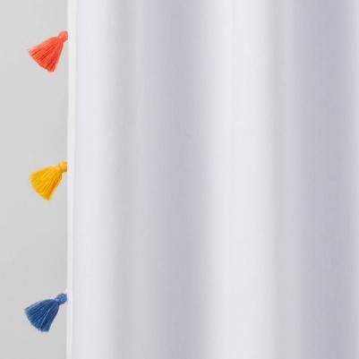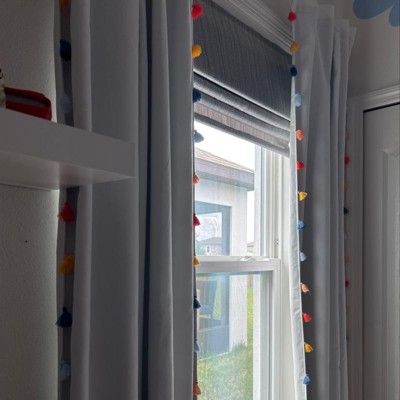 Block out unwanted light in your child's bedroom in a fun way with this Blackout Tassel Curtain Panel from Pillowfort™. This blackout curtain panel brings decorative and functional style to their space. It's detailed with tassel accents on the edging for a playful pop of texture, and the lined construction blocks out most of the sunlight to provide your child a peaceful sleeping environment. Plus, it gives privacy and helps in noise reduction. The classic rod pocket along with a button back tab allows for easy and secure installation. Just fit on a standard rod to complete their window decor.