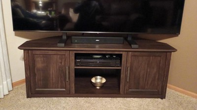 Ideal for smaller living spaces, the Camden Corner TV Stand tucks neatly into any corner. Featuring two cabinets with an adjustable shelf in each, this stand is ready to corral your books, video games, or other media. The open storage in the center offers an adjustable and removable shelf with two pre-cut holes in the back for cable management. Sized to fit most TV’s up to 60 inches, the Camden Low Profile TV Stand exudes rustic style with the look of wood-grain and substantial metal hardware.