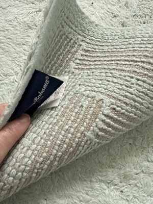 Very pretty aqua color, design, size, and absorbent. I like the cotton—materials like poly stay damp, but this dries out. I’ve bought this set before: the color eventually fades in multiple washings. But it’s fine. My first set lasted a couple years, and these mats are worth it.