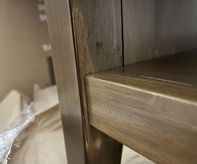 I bought two nightstands. They look nice but the drawers are not soft close, so they are a little loud. For one of the nightstands, the bottom of one of the drawers was damaged. For the other nightstand, the stain was not even applied to the front, so there was an obvious imperfection to the stain application to one of the bottom legs. Note: Be careful screwing in the screws because the wood will crack.