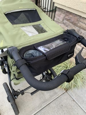 [This review was collected as part of a promotion.] I was gifted this deluxe handbag console and what an upgrade from what I had been using. It was very easy to install and fits perfect on my BOB Alterrain Pro stroller. The large cup holders fit my water bottles. The phone pouch with touch screen access makes me feel like my phone is protected yet available. I also appreciate the tire pump so I will never have to run home on a flat tire ever again! Also, the quality is wonderful. This console is well made and I can already tell will hold up well and not fray or fall apart.