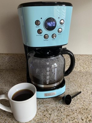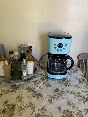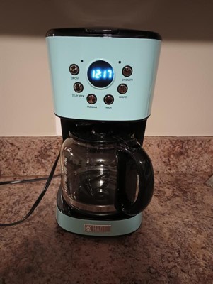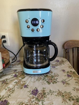 [This review was collected as part of a promotion.] I adore this gorgeous vintage coffee maker. The blue is such a rich beautiful color and the style gives a wonderful vintage touch to my kitchen. The features on it are amazing. I love that I can set it and forget it plus I can control the brew strength. The digital display for the time is a wonderful addition as well. It even came with a reusable plastic filter as well.