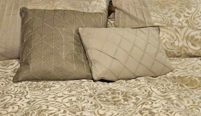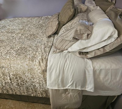 [This review was collected as part of a promotion.] I am obsessed with this Madison Park - Emilia 12 Piece Jacquard Comforter Set with Bed Sheets. It is a beautiful khaki and gold comforter set that adds so much elegance to my bedroom. I love the gold accents it has and love that it is a 12 piece set that comes with a sheet set, bed skirt , comforter, decorative pillows, shams, and Euro Shams! I love that it can be thrown in the washer as well if needed, no special washing needed. I do need to still get some Euro pillows so I am not able to use the Euro shams just yet.