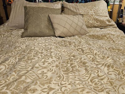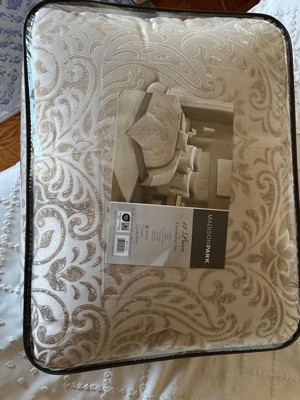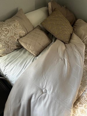 [This review was collected as part of a promotion.] I am obsessed with this Madison Park - Emilia 12 Piece Jacquard Comforter Set with Bed Sheets. It is a beautiful khaki and gold comforter set that adds so much elegance to my bedroom. I love the gold accents it has and love that it is a 12 piece set that comes with a sheet set, bed skirt , comforter, decorative pillows, shams, and Euro Shams! I love that it can be thrown in the washer as well if needed, no special washing needed. I do need to still get some Euro pillows so I am not able to use the Euro shams just yet.
