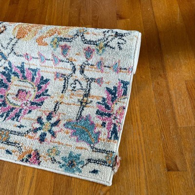 I bought this to go under a small blue velvet loveseat/sofa also from target. I chose the ivory with blue, gold, and pink design. It is beautiful without being overwhelming. I will probably put a rug pad (like a re-used old yoga mat) under it to make it softer and warmer on my cold basement floor. This was my first time buying a circular rug and it really added interest and softness to my small boxy room.