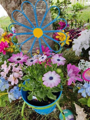 [This review was collected as part of a promotion.] A Beautiful freestanding blue daisy flower design planter. These comes in different colors. It adds a stylish accent to you outdoor decor. Add you favorite potted flowers in contrasting colors to brighten up your favorite outdoor spot. The stand keeps your planter/potted flowers off the ground and to move around with ease. Even if you don't have a green thumb this will make it look like you do. Group together or alone. Extremely durable as an accent piece or a focal point in your garden, patio or deck! These will make your outdoor space stand out. Great quality material to use year after year.
