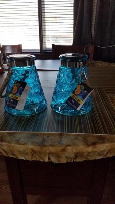 [This review was collected as part of a promotion.] The blue Alpine Solar lights are a great addition to my patio. The glass is thick enough that I am not worried that wind will blow them over, which can be significant where I live. The solar light is refracted in the glass pattern which is lovely, picture below. When the wasps arrive, I may try to hang one of the lanterns on a shepherds hook and carefully tilt it to fill it with something that will attract wasps. The “lip” on the lower part of the lantern will hold some liquid and I assume once they enter, they cannot escape. At this point, I enjoy the lights for decorative purposes and if I am able to trap wasps, that will be a bonus!