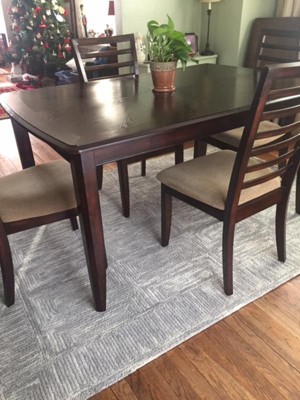I recently purchased the Grey 5x7 rug for my parents dining room and was pleased by how perfectly it fit under their dining room table. The rug adds warmth to the room as most of their furniture is dark. It has just the right amount of thickness and comfort for walking on. Great versatile grey tone and the pattern would easily conceal dirt marks from foot traffic. The neutral color should go well in any room.