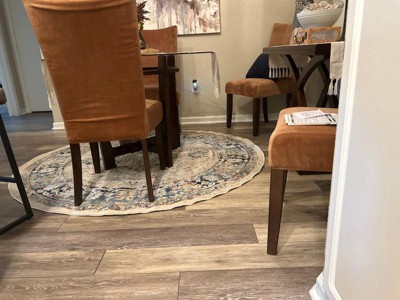 [This review was collected as part of a promotion.] Beautiful colors. Works well under our dining room table. Fairly thin though so if you're looking for something more plush, this wouldn't be what you're looking for.