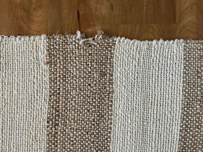 [This review was collected as part of a promotion.] This rug has a nice weave and I love the color, however there is a large flaw on one of the edges. I kept it rather than go to the hassle of shipping it back. If I had purchased it in a store I would have returned it.