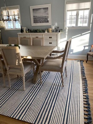 This casual striped rug with tassels is handmade from cotton and wool. It is sleek, simple, and refreshingly lightweight. Choose from either colorway for a more nautical or neutral look and feel. A rug pad is recommended to prevent slipping and to keep the rug lying flat in one place