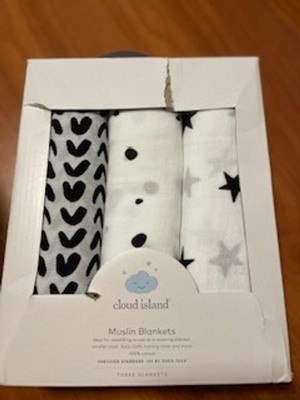 Absolutely love these muslin blankets by Cloud Island. They’re good quality, soft and just perfect. The black and white pattern is perfect for either gender. I would definitely Recommend these to any parent!