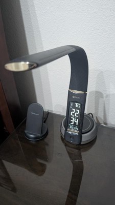 [This review was collected as part of a promotion.] Love this desk lamp! It is so super slim that it takes up no room on your desk or bedside table. Love how slim it is. The clock is easy to see, with alarm. The top of the lamp adjusts to where you need it. Up, down, left, right.