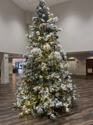 • A: The tree features heavy flocking, simulating fresh snowfall, giving it a unique aesthetic.