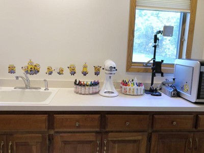 I’m a kid at heart and a *huge* Minions fan! I’m always looking for something fun to make my work spaces more interesting, and these Minions were just what I was looking for to put in my “cookie room.” I decorate sugar cookies so I end up spending a lot of time working in this space. I really love how cute and cheerful these little guys are! They sure add a lot of character to what was a very boring, utilitarian work area! There are a lot of decals in the pack and I didn’t use them all, so I might put some up in my office space too.