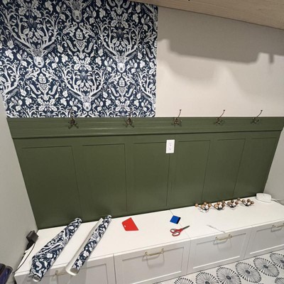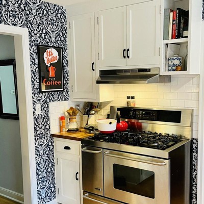 This wallpaper is GORGEOUS! This is the third time I’ve used peel and stick wallpaper and I definitely recommend it. It is so easy to put up and very forgiving if you need to reposition it. This pattern didn’t line up as perfectly as I would have wanted but it is so busy that it isn’t noticeable. The quality is good enough that it didn’t stretch when putting it up. The hardest part was moving my hoosier cabinet and putting it back. It took me less than two hours to do this wall by myself, including moving the cabinet and cleaning up. It has given my kitchen a fun look. Now to paint my shelf.