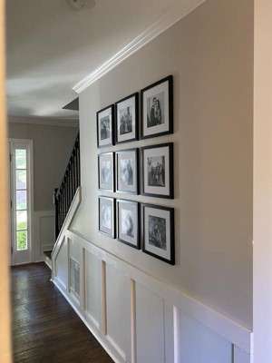 The hanging hardware on the back of the frames is placed very inconsistently. This means that simply placing the nails in a straight, level line will not result in straight and level frames. It also means that if you want to swap two photos, you can't just switch where the frames are located. You have to leave the frames and change out the photos. My advice is to number the frames befoew hanging so if you ever have to take some down you know which spot each goes in when you hang them back up. Ultimately I am happy with the final result but the process of hanging them was annoying.